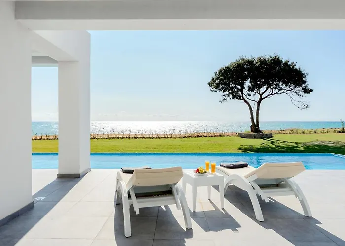 Вилла Seafront Villa Nafsika - Private Heated Infinity Pool - Direct Access To The Beach - Play Area предлагает 4 спальни и веранду для загара, террасу для загара и принадлежности для барбекю. В 3 км гостей ожидает Ruins.